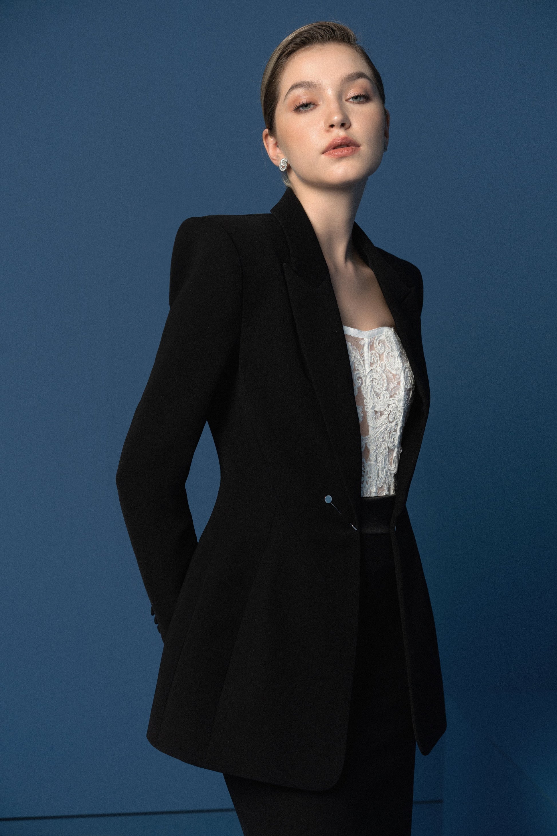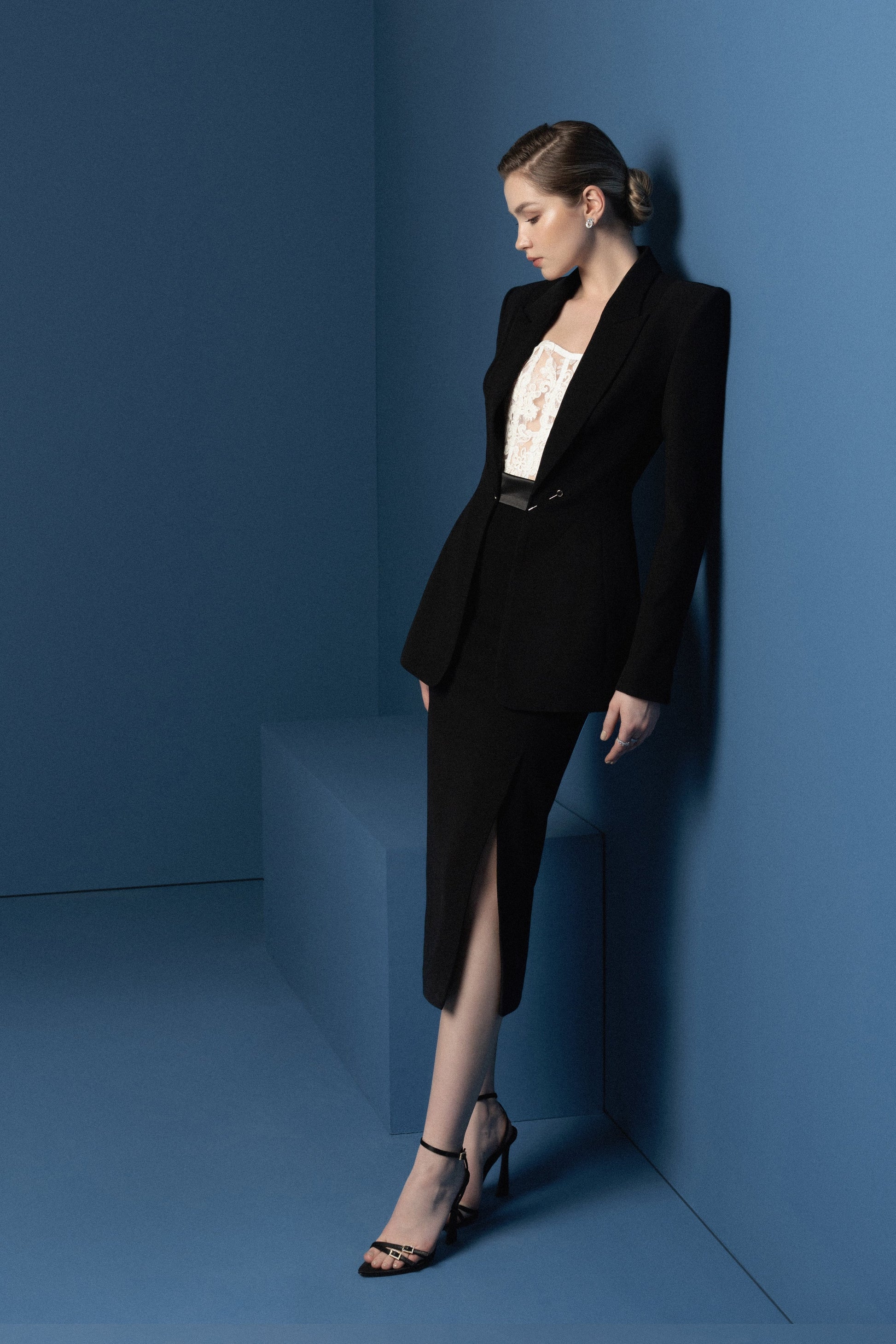 Tối giản trong màu sắc, tối đa trong sắc thái thể hiện, LEKIEU đã khai thác triệt để bảng màu quen thuộc để tạo nên cá sắc đen/trắng gợi nét tĩnh lặng và vẻ đẹp gợi cảm trên Gwenyth Jacket. Phong cách nghiêm nghị và uy quyền với cầu vai ngang và corset thắt eo tạo điểm nhấn trên toàn thể trang phục.