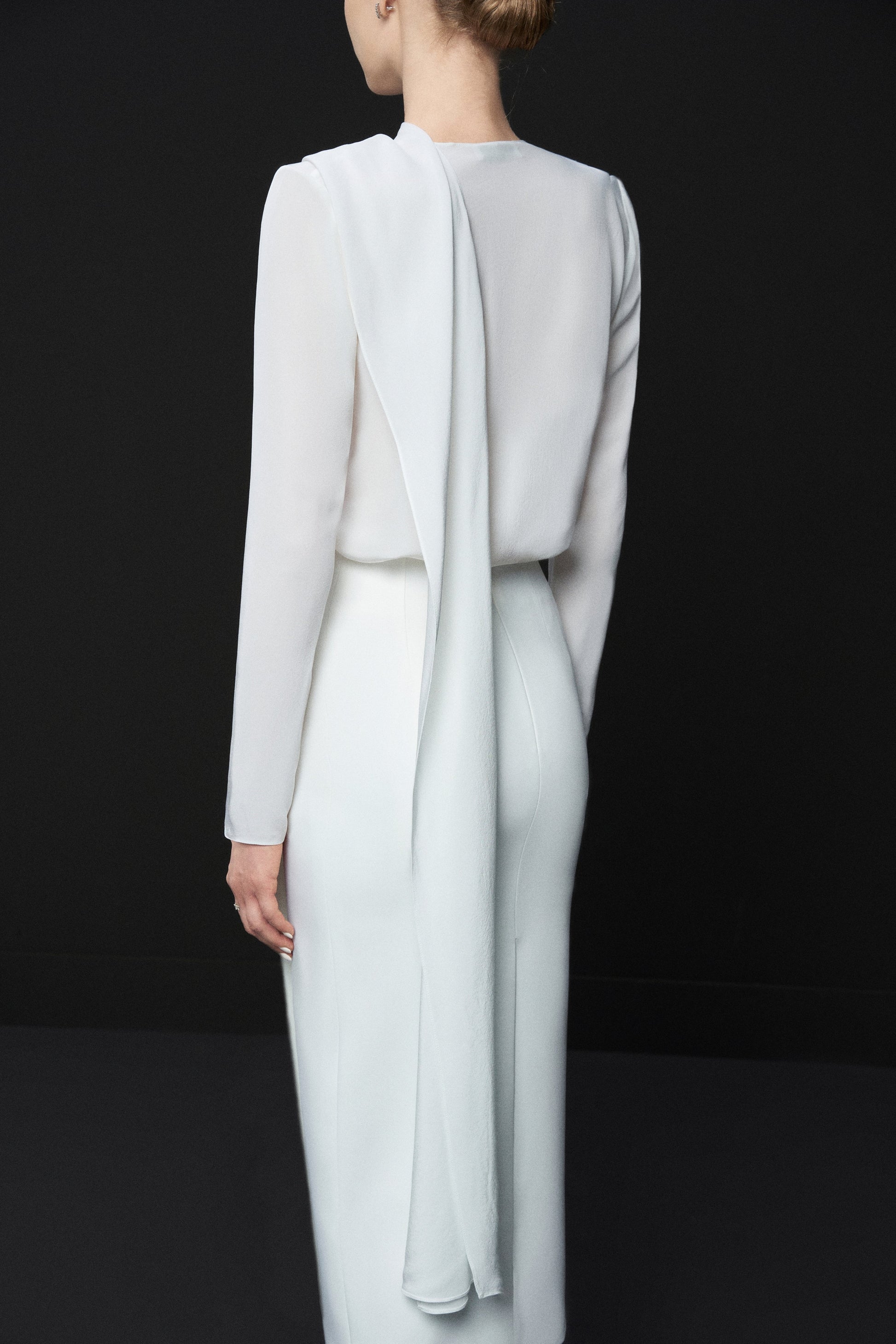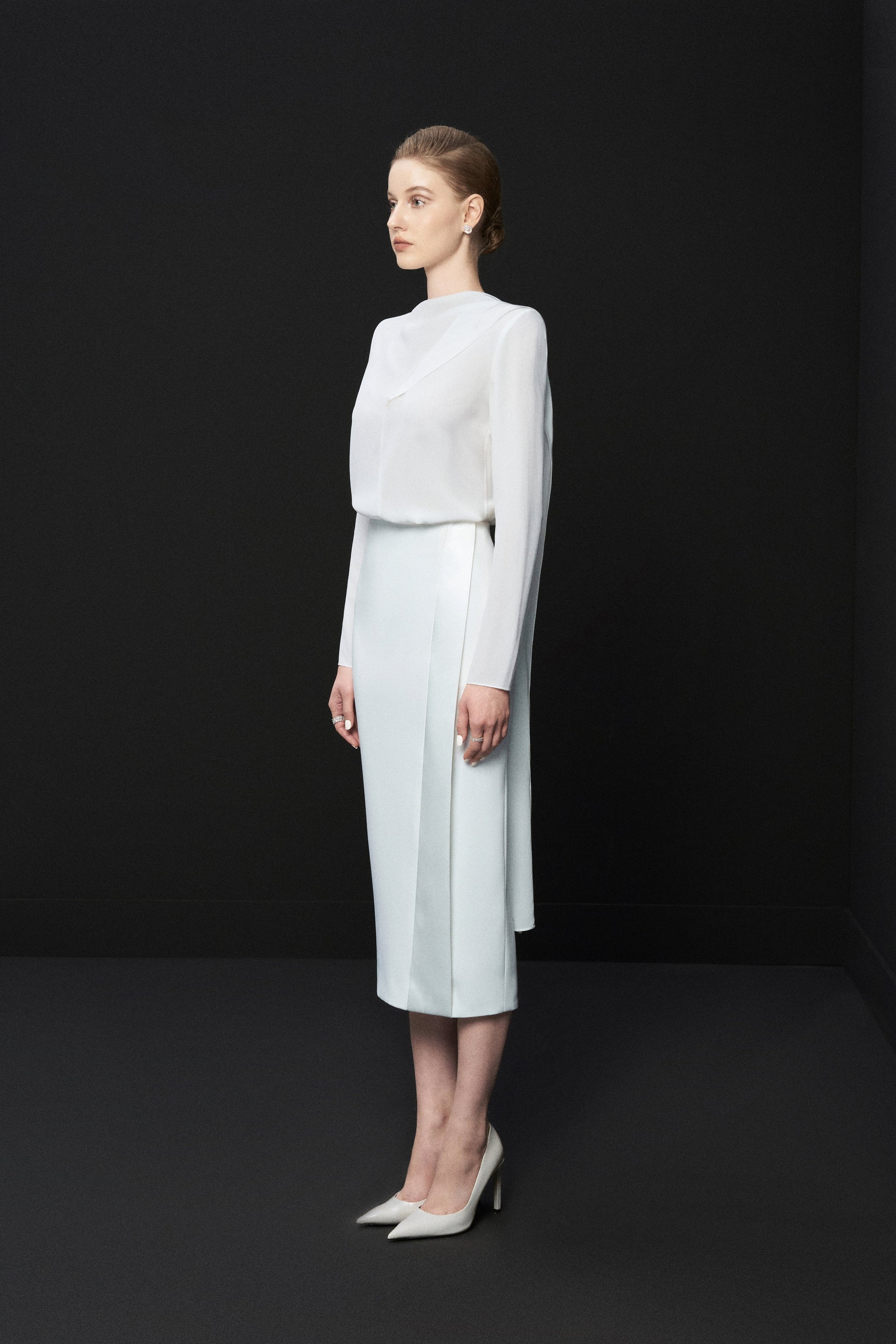 Chiếc áo với điểm nhấn nằm ở phần vạt khăn mang đến sự khác biệt tinh tế, dễ dàng biến hoá tạo nên những diện mạo khác nhau. Mang dáng vẻ sang trọng khi phối cùng chân váy ôm lưng cao tạo nên sự cân bằng giữa nét thanh lịch và thoải mái.