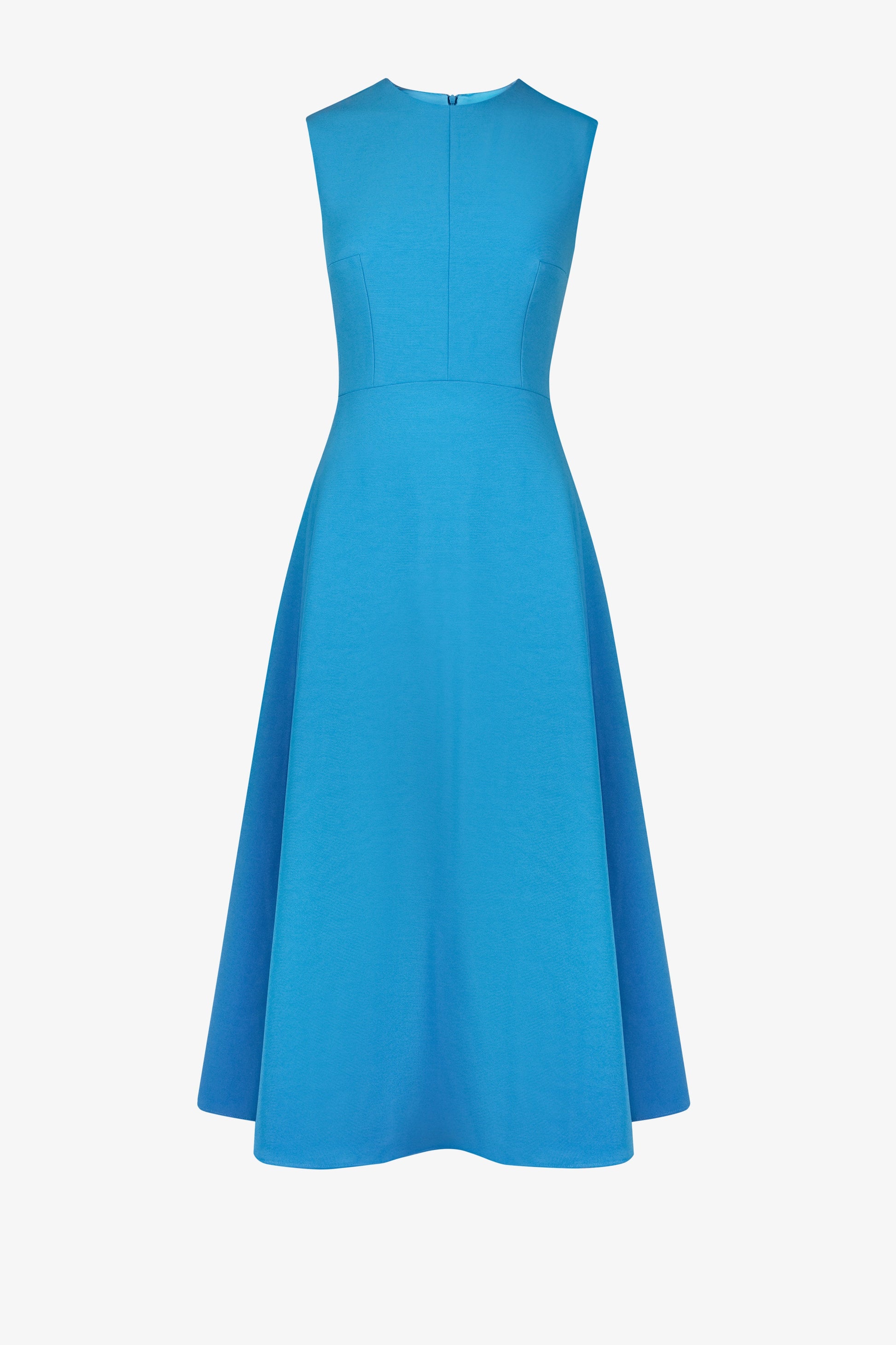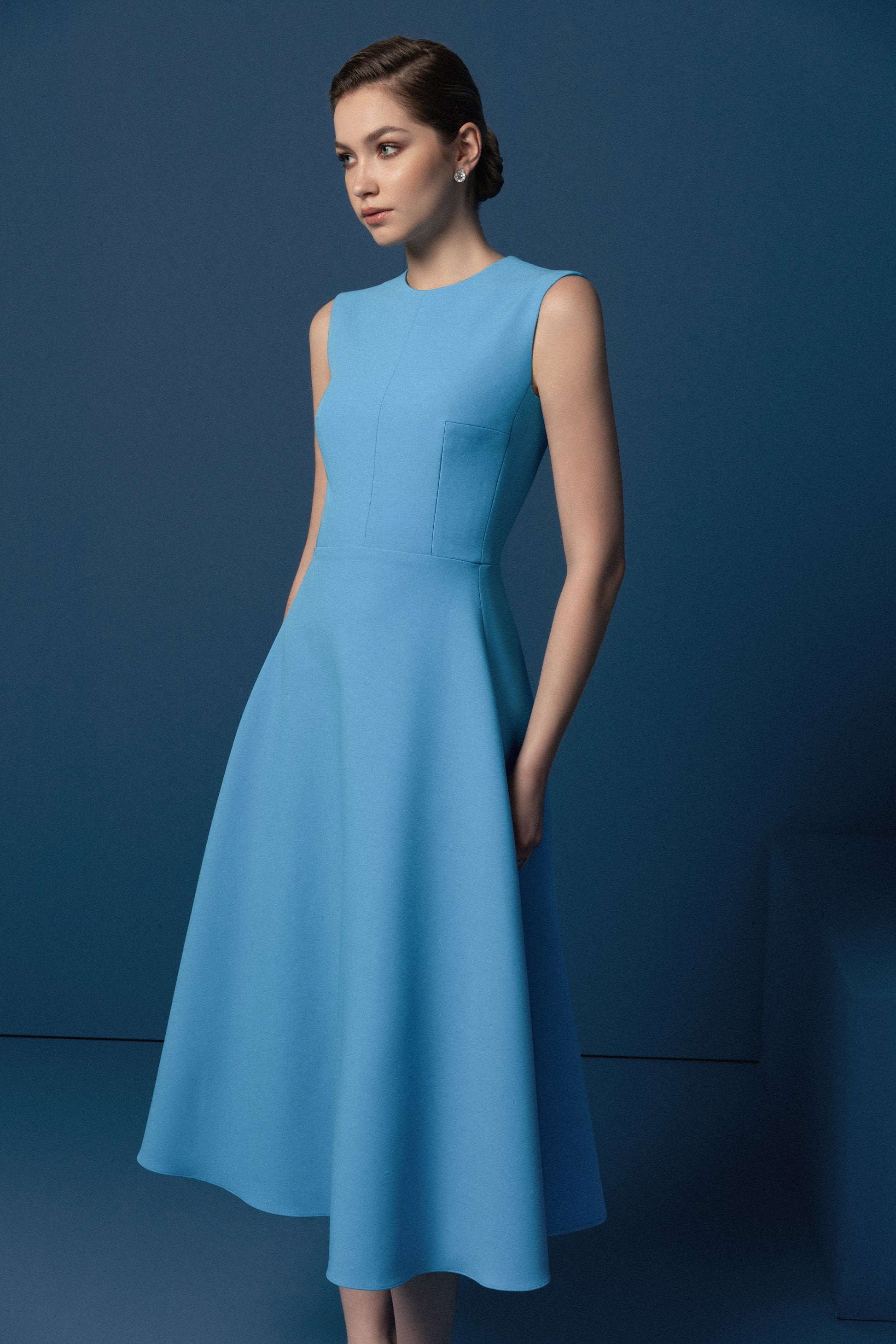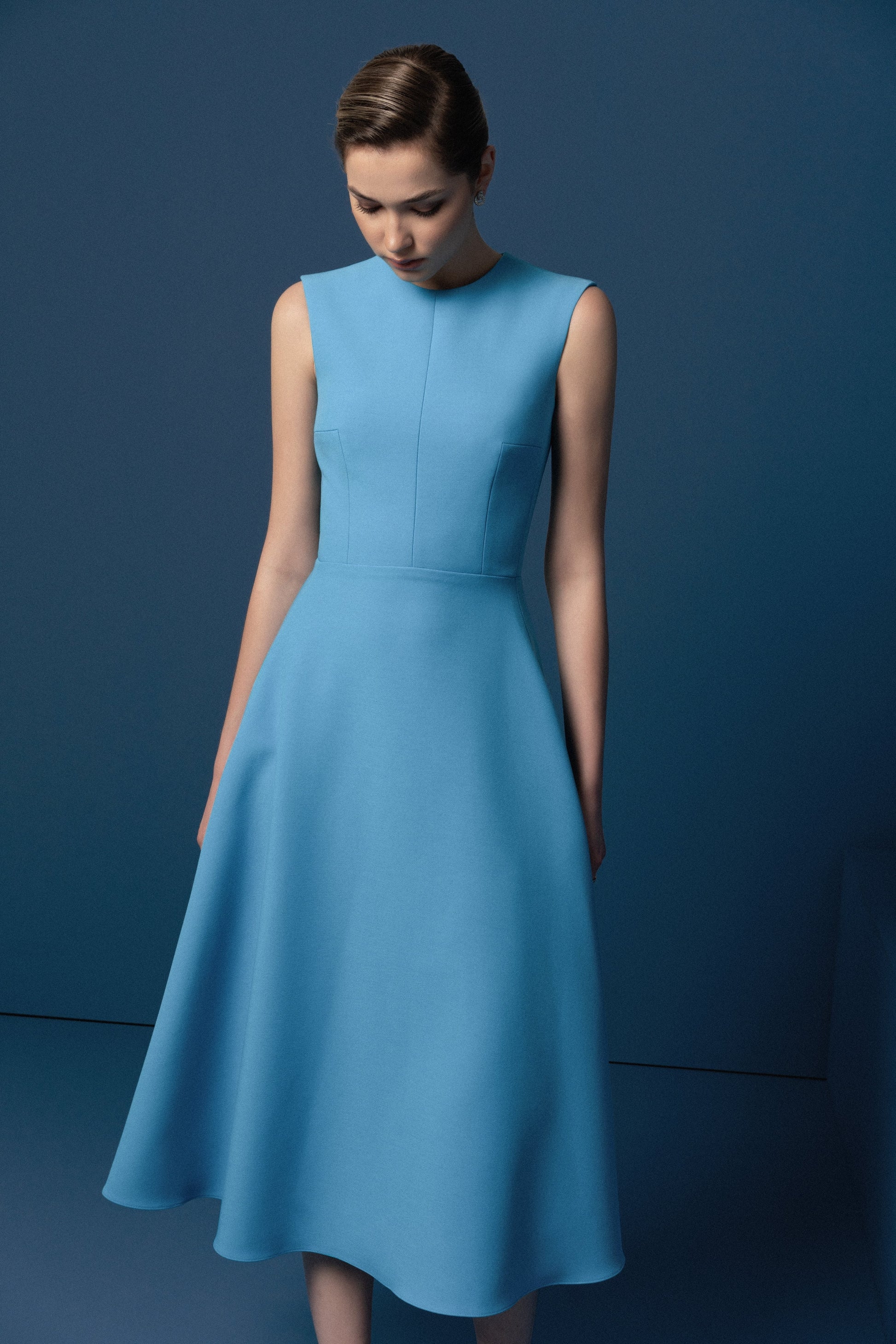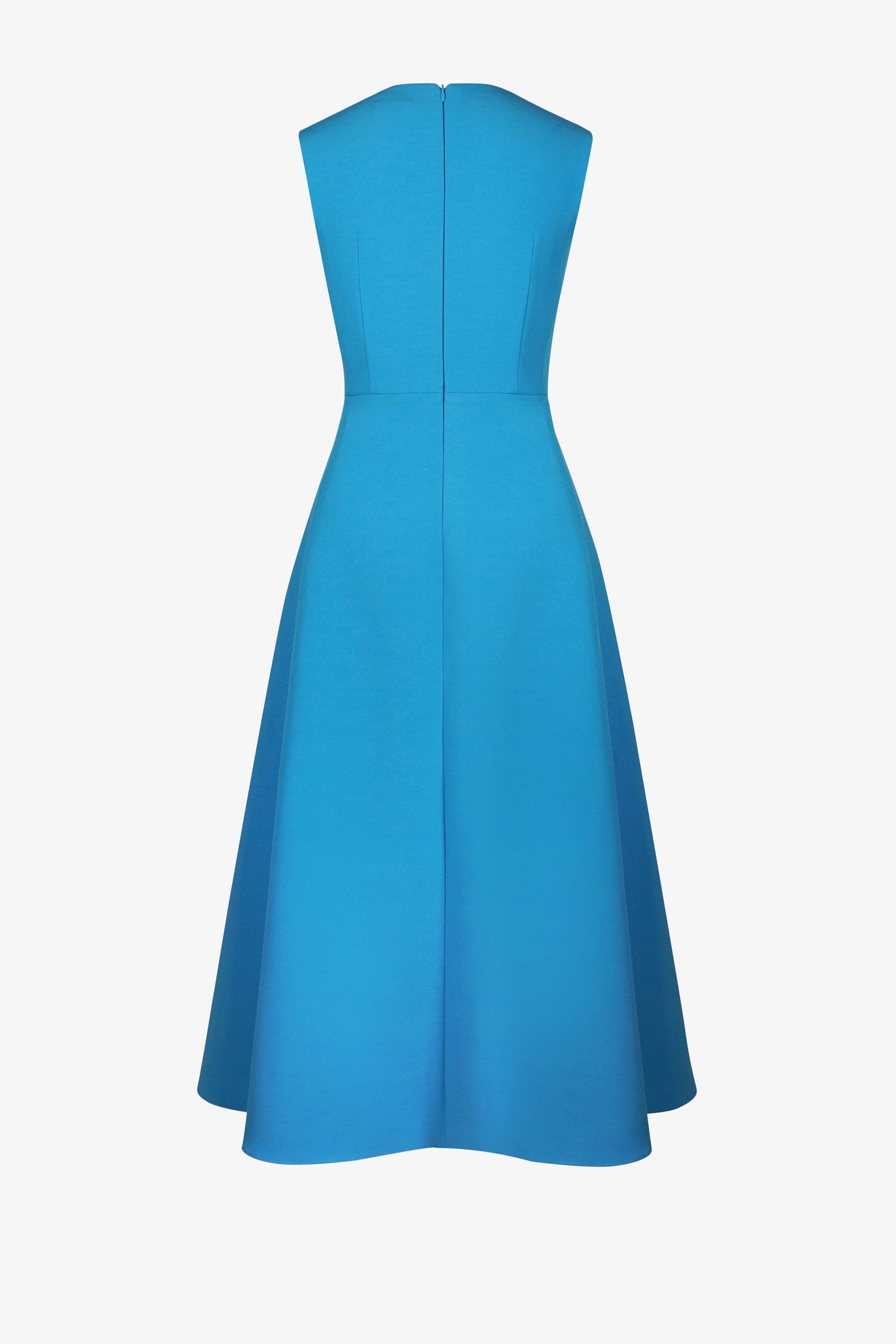 Đầm cổ tròn, sát nách, ôm xòe, bổ thân, tùng dưới thắt tròn tạo độ rủ cho toàn thể trang phục, khóa lệ thân sau.