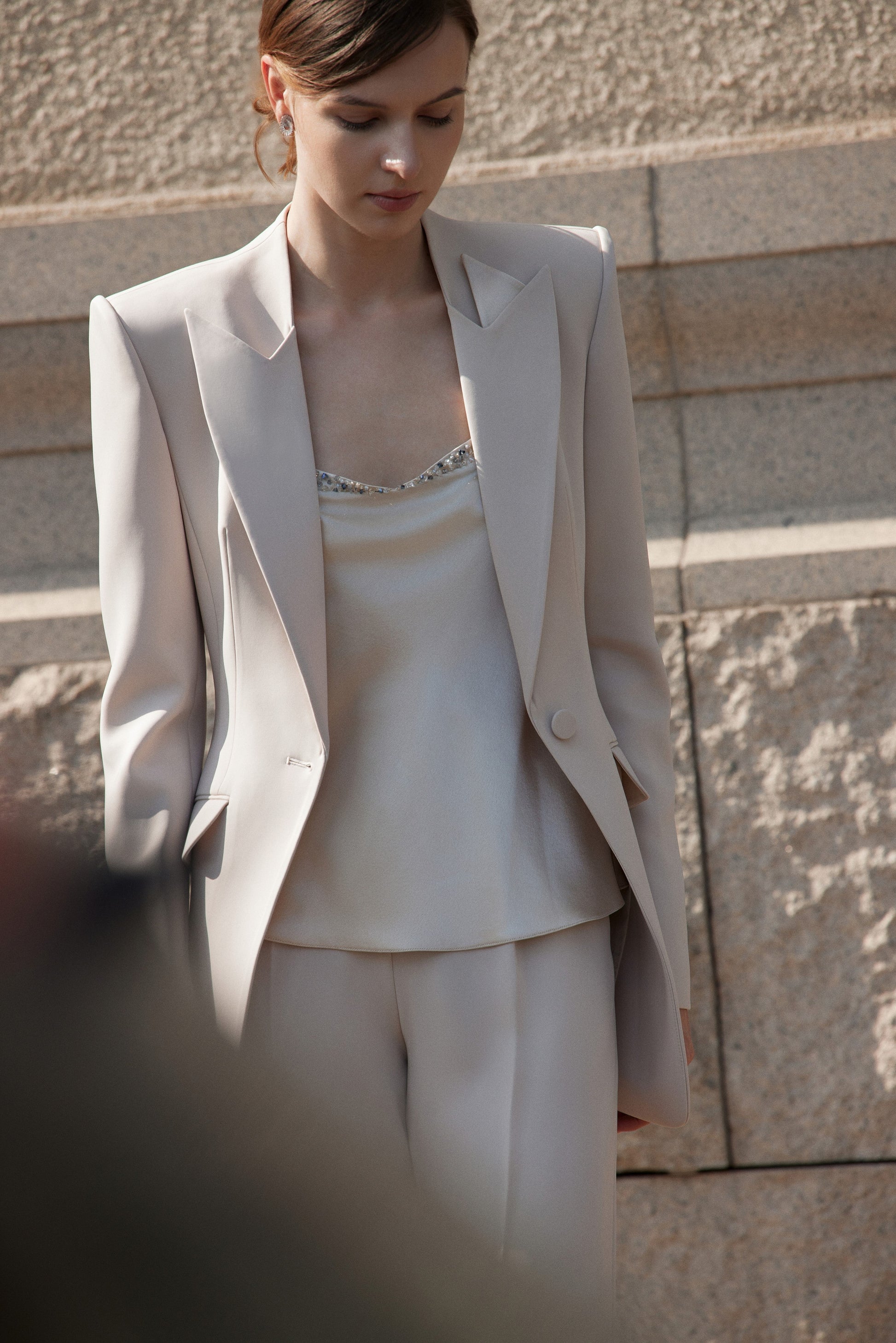 Được xử lý dưới chất liệu Marocain Crepe tạo độ mềm rủ, cùng thiết kế ống suông thẳng tạo những bước đi uyển chuyển, tôn vinh vóc dáng người phụ nữ.