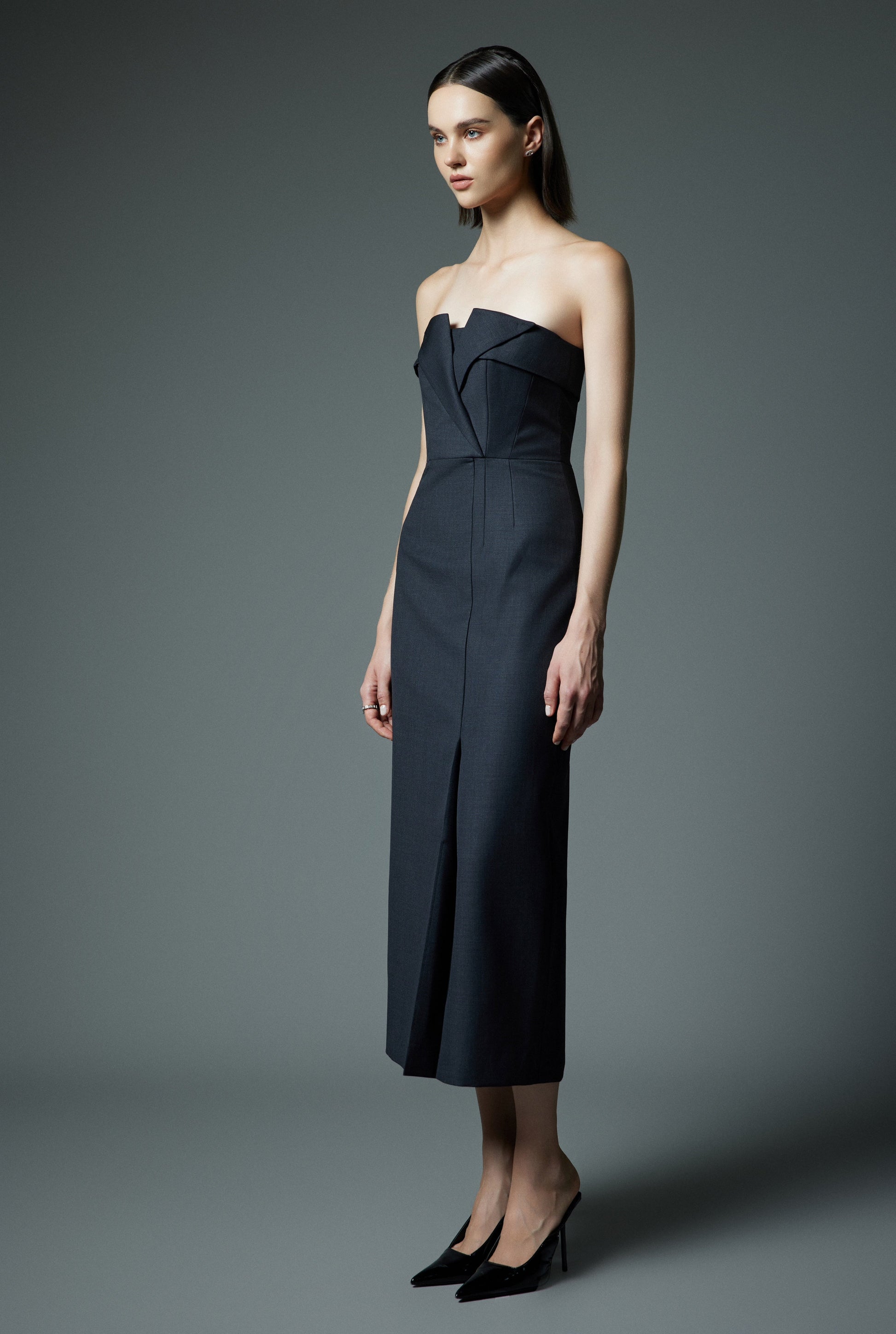 Đầm dài qua bắp, thân trên dáng quây với chi tiết ve cổ vest bong, 2 ly,, thân dưới dáng bút chì có 2 ly, 1 ly gập ở giữ, bong phần gấu. Thân sau trên dưới có 2 ly, khoá giữa và có xẻ chồng.
