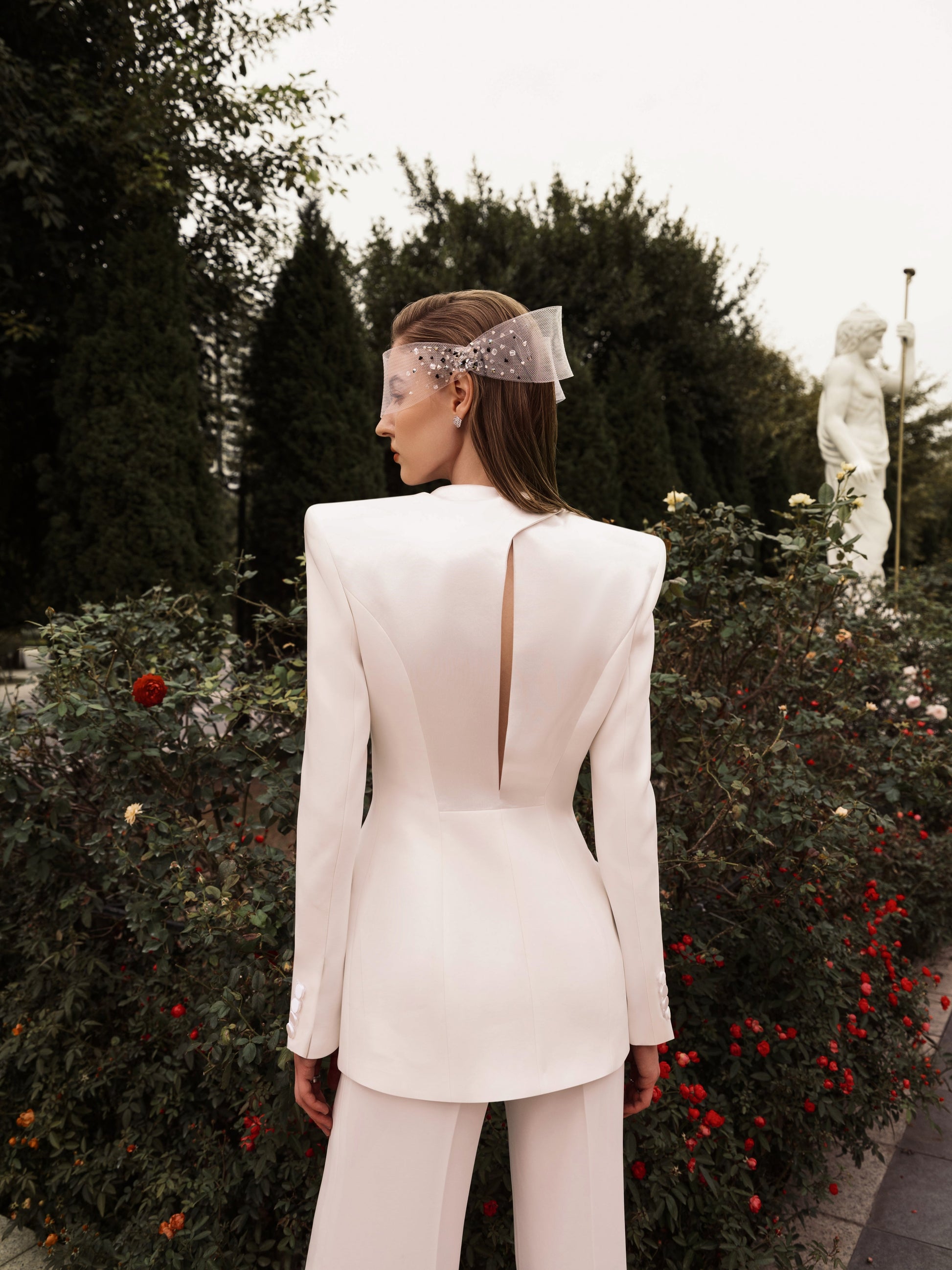 Áo Suit dáng ôm Single – breasted – 1 hàng khuy có 2 khuy, cổ sam vạt khăn được thiết kế bắt chéo, vạt gấp nếp cố định, tạo đường cong liền mạch nối dài từ thân sau qua cổ ra phía trước tạo điểm nhấn độc đáo cho cổ áo, phần lưng sau xẻ tách gợi cảm. Sản phẩm được dùng cho những dịp trang trọng và có tính nghi lễ. Áo form dáng dài, ôm sát eo. Tay kiểu 2 mang may cá tay, đính cúc. Có 2 túi cơi có nắp chéo thân.