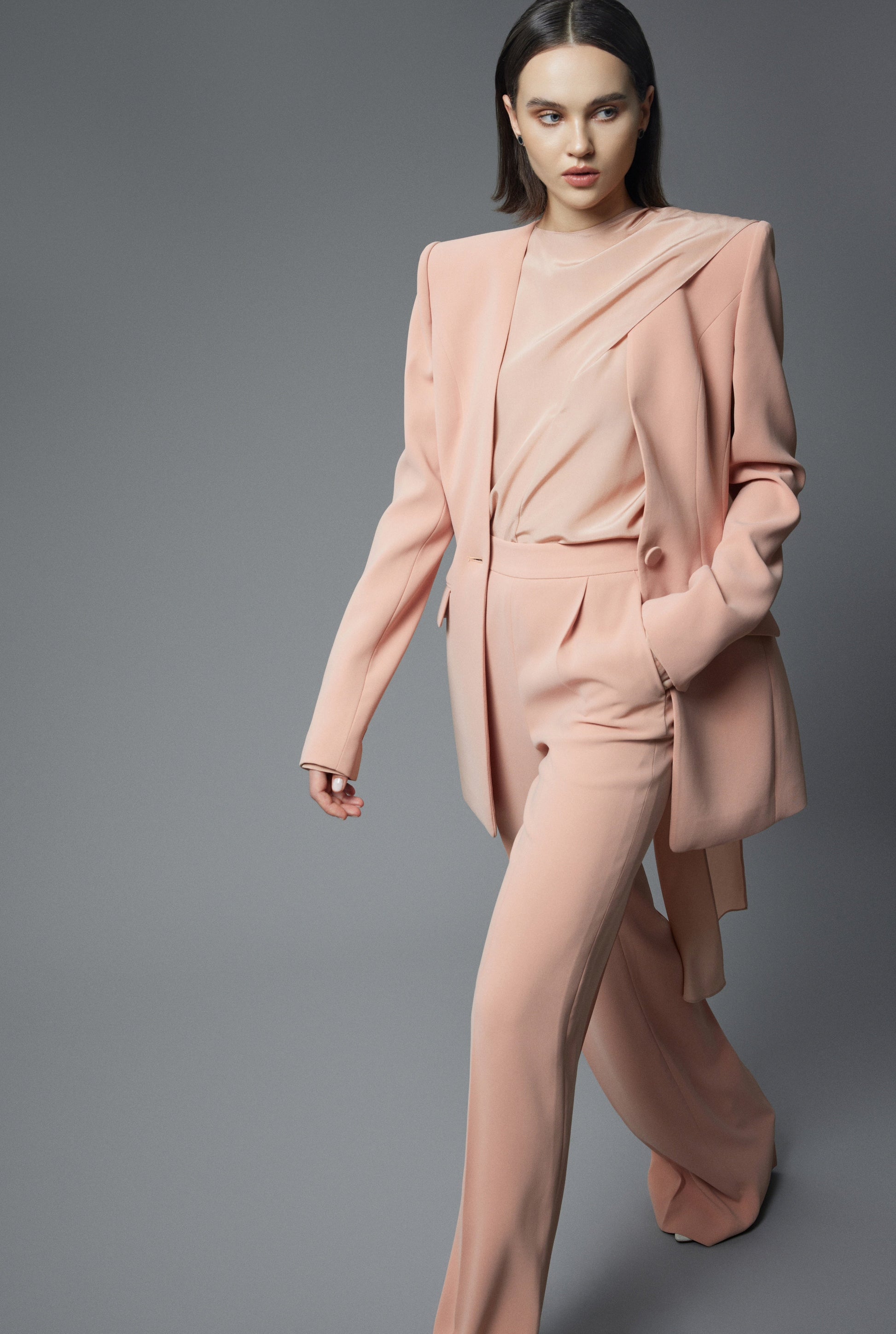 Vest dáng ôm eo và phồng đuôi, không cổ áo, 1 nút cài và tay áo 2 hai mang cổ tay có 4 nút cài làm từ chất liệu cùng với thân áo.