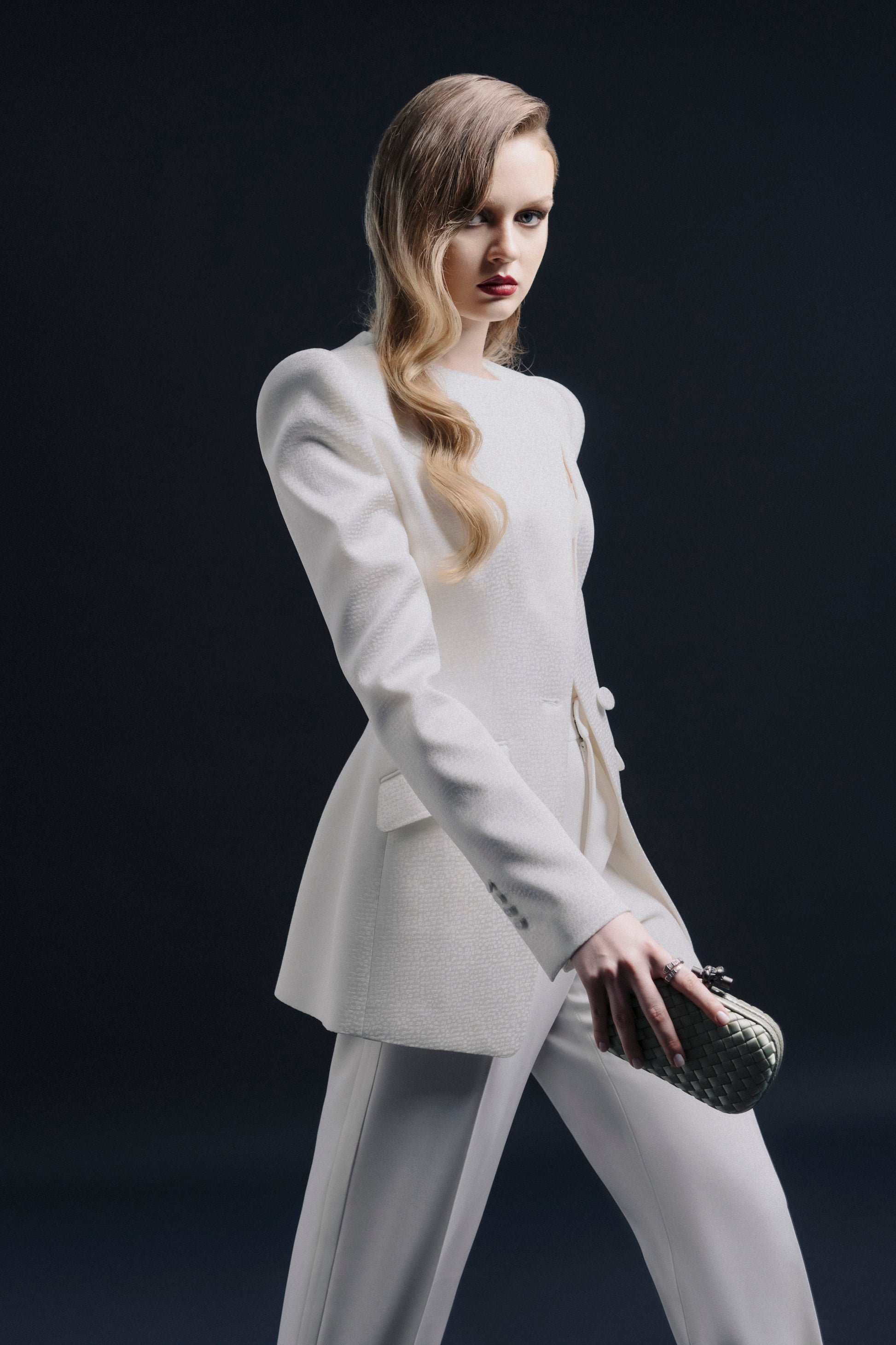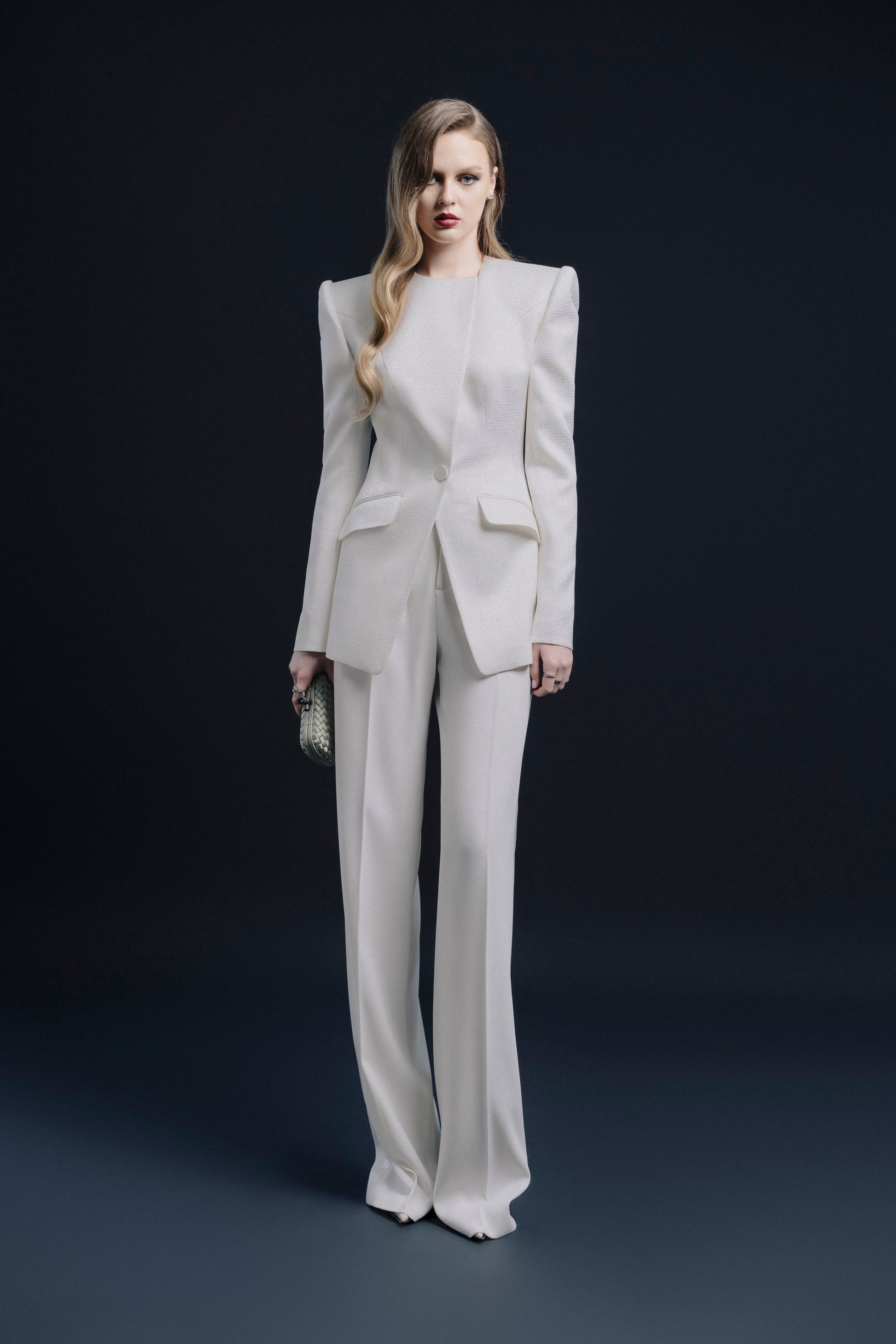 The fitted vest features a left-shifted collar, with a large button and a smaller button hidden inside the lapel to keep the collar in place. The sleeves are adorned with four buttons covered in the same fabric. The asymmetric cut of the jacket includes two slanted patch pockets.