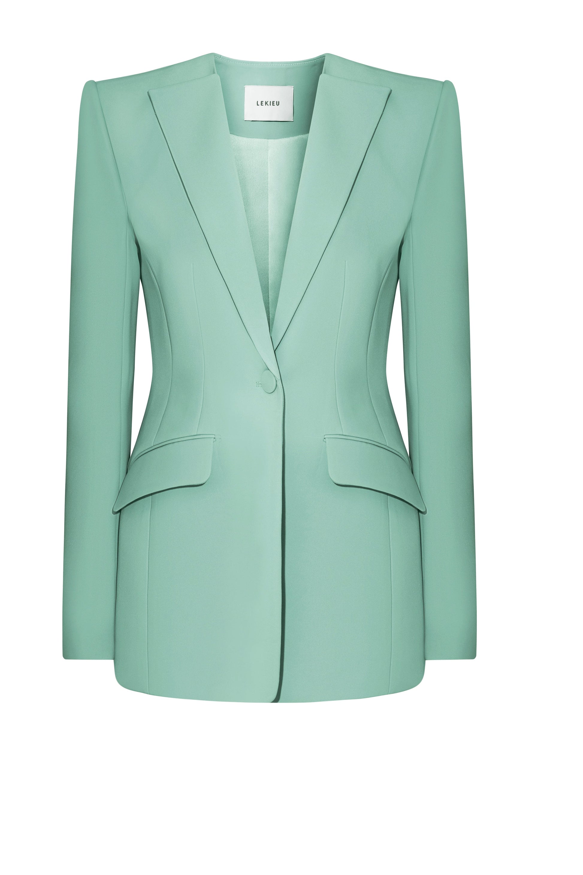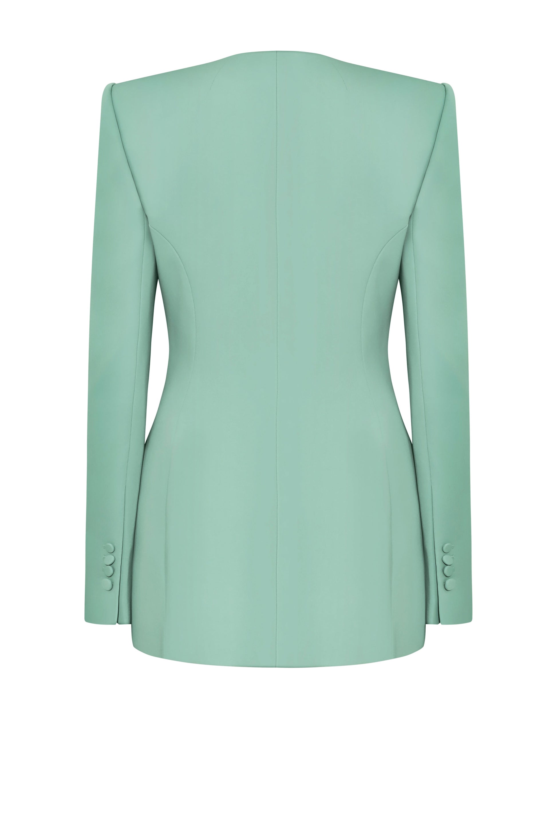 Boxy-shoulder vest with a wide notch lapel and collarless neckline. Front features two vertical darts and side panels for shaping, with angled flap pockets. Single front button closure covered in self-fabric. Two-piece sleeves finished with four matching fabric-covered buttons. Hemline is straight with a subtle curve at the bottom. Back includes a center-back seam and side panel darts for structure.