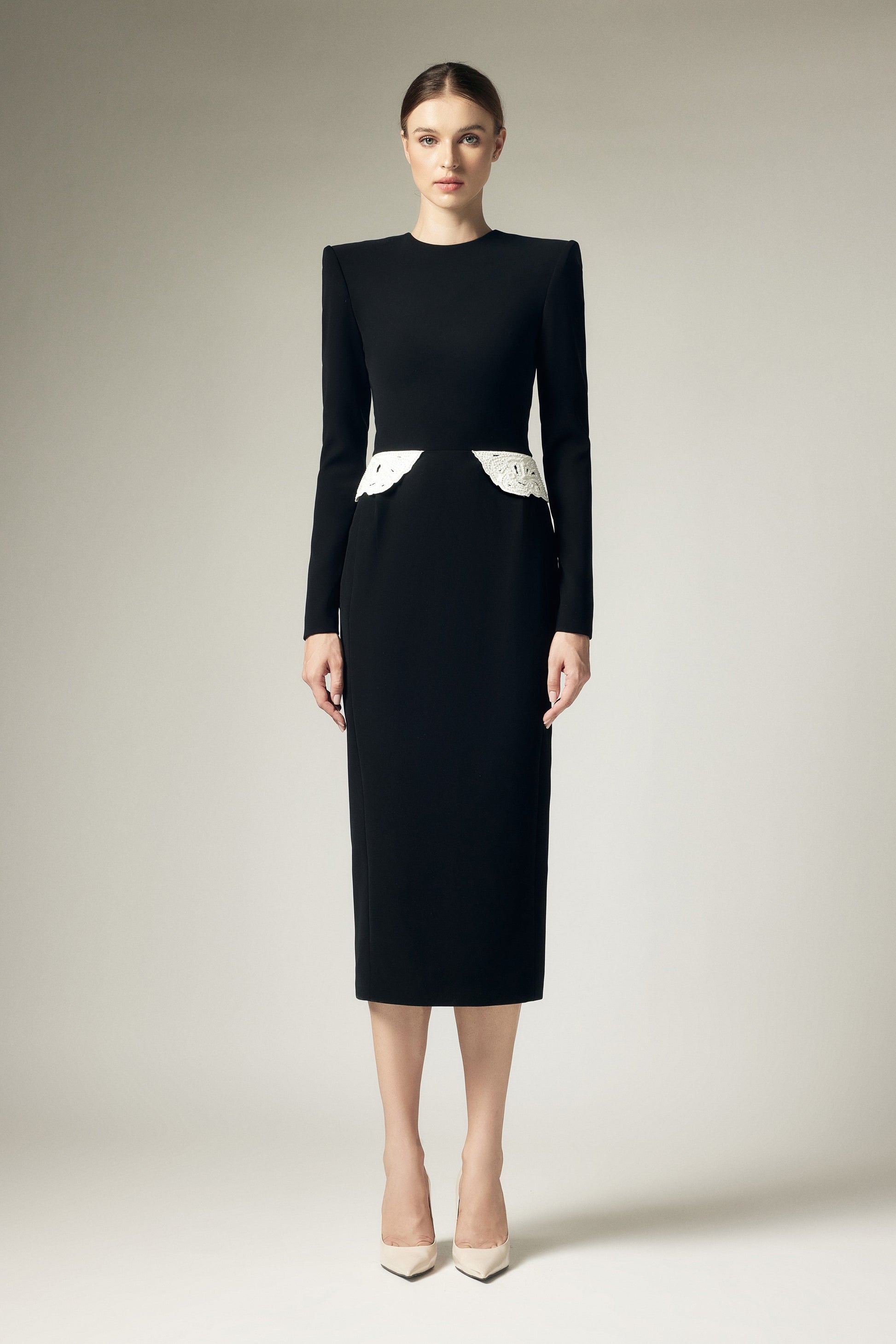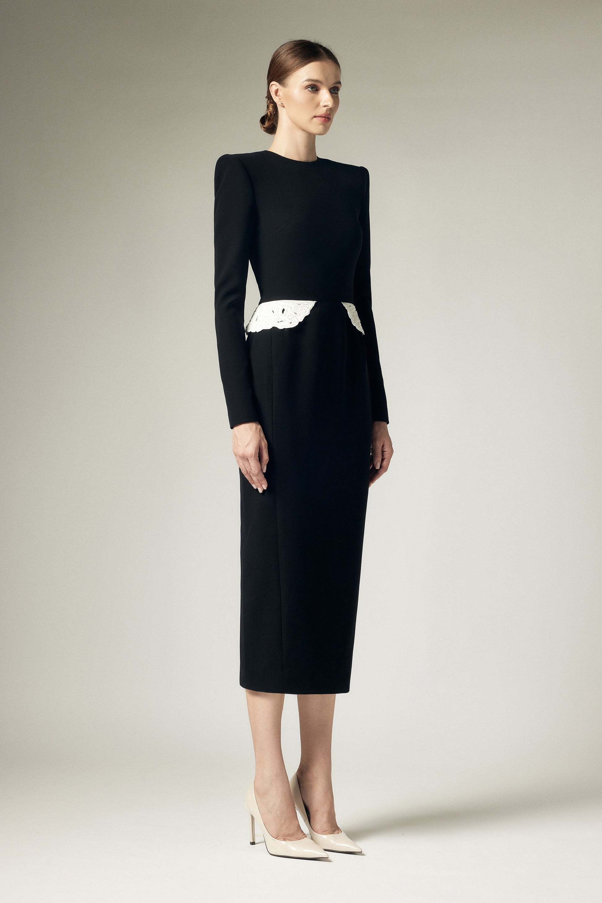 Đầm bút chì dáng ôm, cổ tròn, vai ngang, có ly ben, ly sườn lửng, cắt eo đắp ren thủ công lật xuống. Thân sau có khoá lệ, xẻ chồng và hai ly sườn lửng. Tay dài có mang.