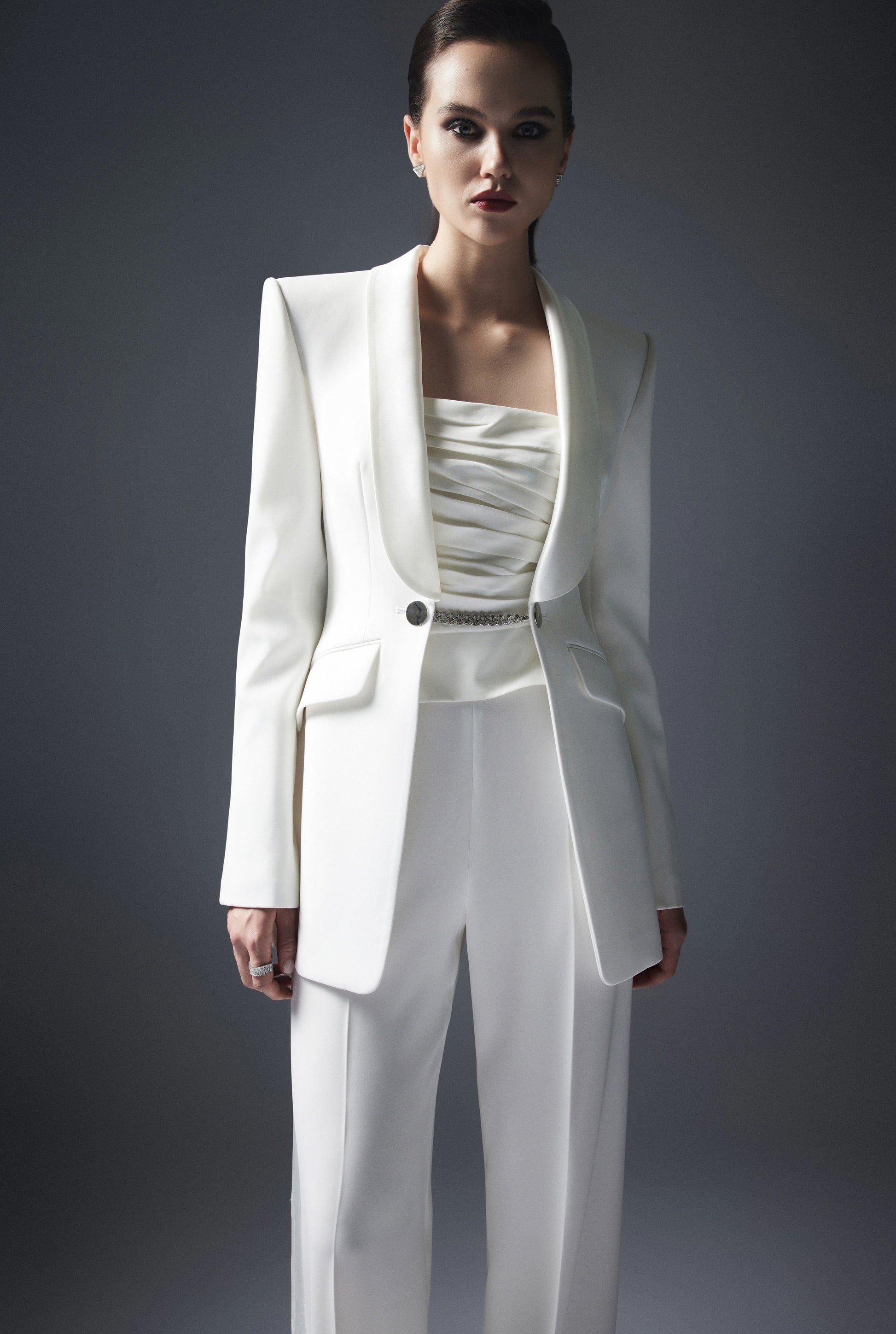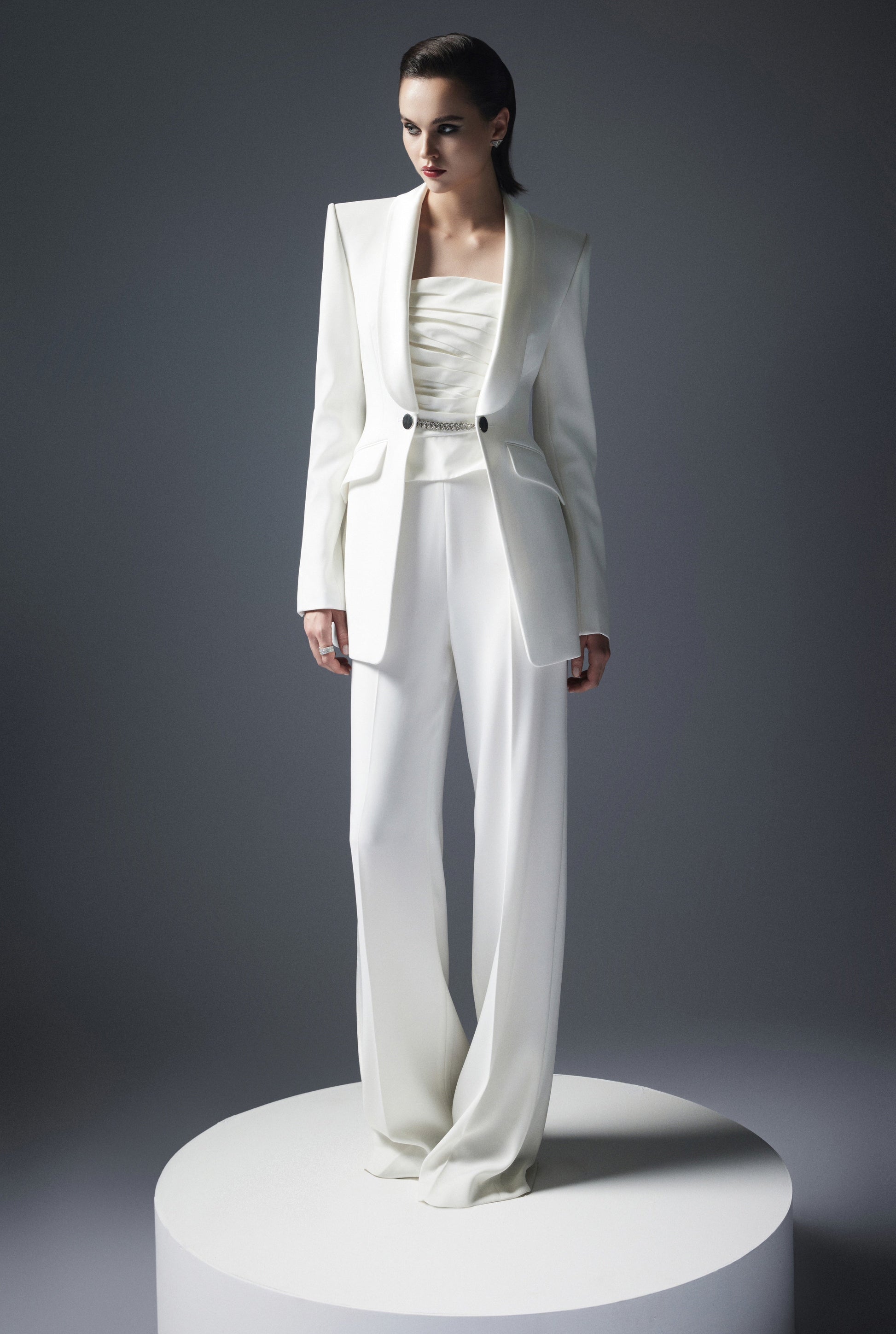 Tái hiện nguyên mẫu Smoking Jacket với điểm nhấn tại chi tiết cổ sam phối sateen, Ourense Jacket sử dụng kỹ thuật cắt dựng mang cảm hứng bespoke cùng phom dáng được cá nhân hoá tôn vinh đường cong cơ thể. Ảnh hưởng của nghệ thuật đương đại được lồng ghép qua sự lược bỏ hàng khuy truyền thống để thay thế bằng xích cài, khéo léo phối cùng áo quây xếp nếp thủ công và quần ống suông để mang tới tổng thể trang phục hoàn hảo cho những sự kiện mang tính nghi lễ.