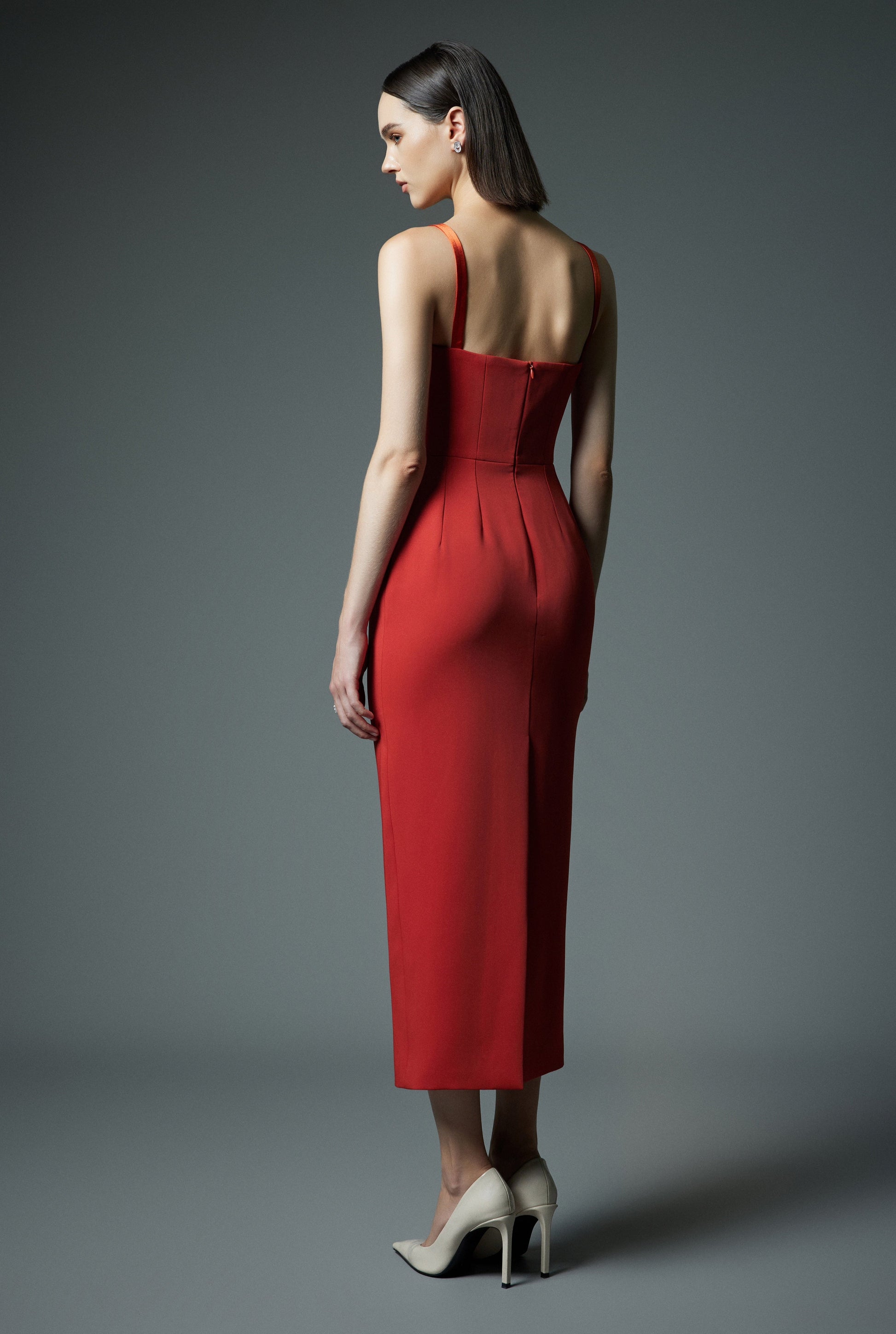 Váy dạ hội với thân dưới dáng bút chì dài qua bắp, có 2 li trước và sau. Đường may can ở eo. Thân trên được theiets kế theo dạng corset có cúp ngực, được đình hình bằng gọng và 2 dây váy được làm bằng vải satin. Khoá ở giữa thân sau và có xẻ chồng