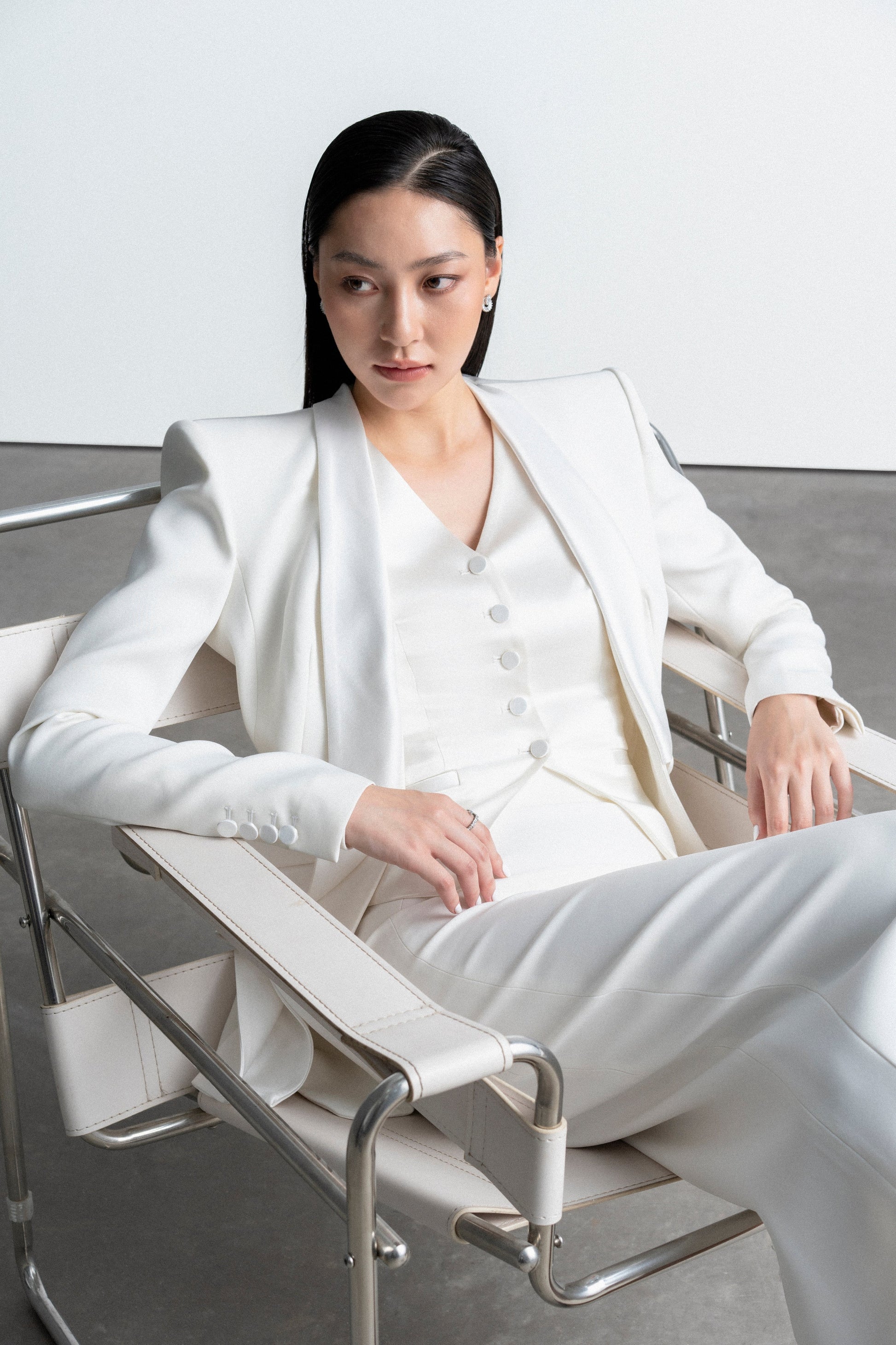 Áo gile không cổ phom ôm bám, thân trước có 3 ly chiết, áo có 1 hàng khuy gồm 4 khuy.
